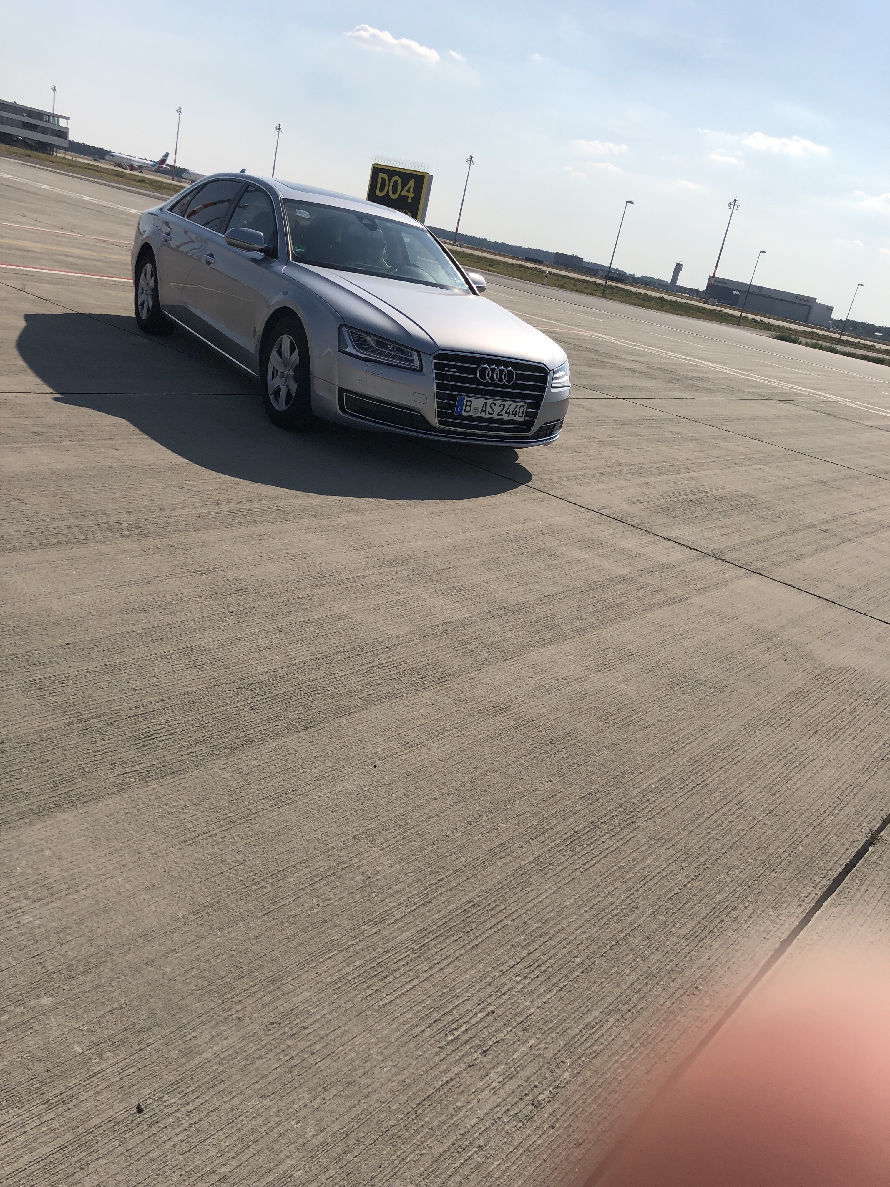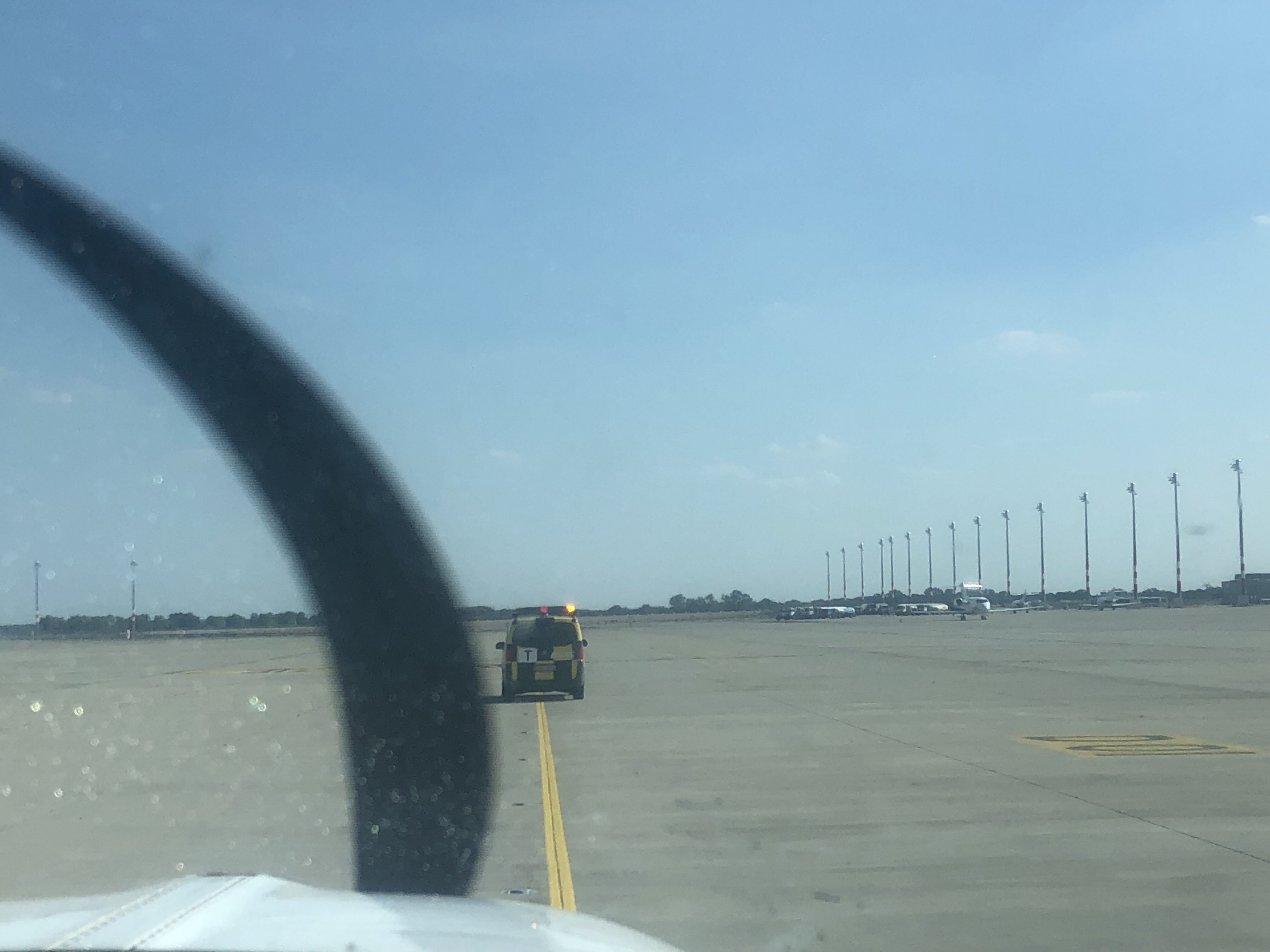 J’évacue à gauche , notre follow me car arrive et nous guide sur notre parking.
