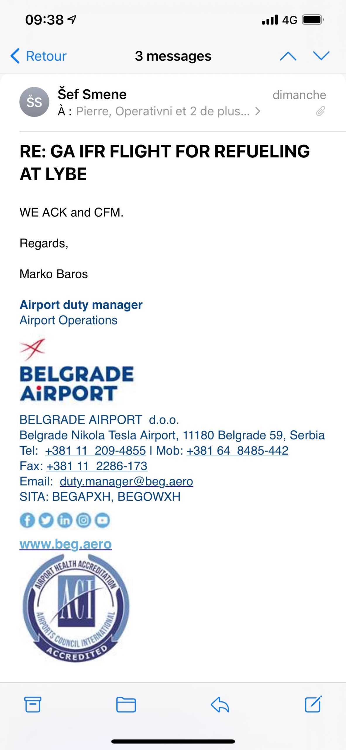 Contact pris avec la Serbie , ils confirment que l’on peut venir par un simple « WE ACK and CFM » comprendre Acknowledged and confirm !