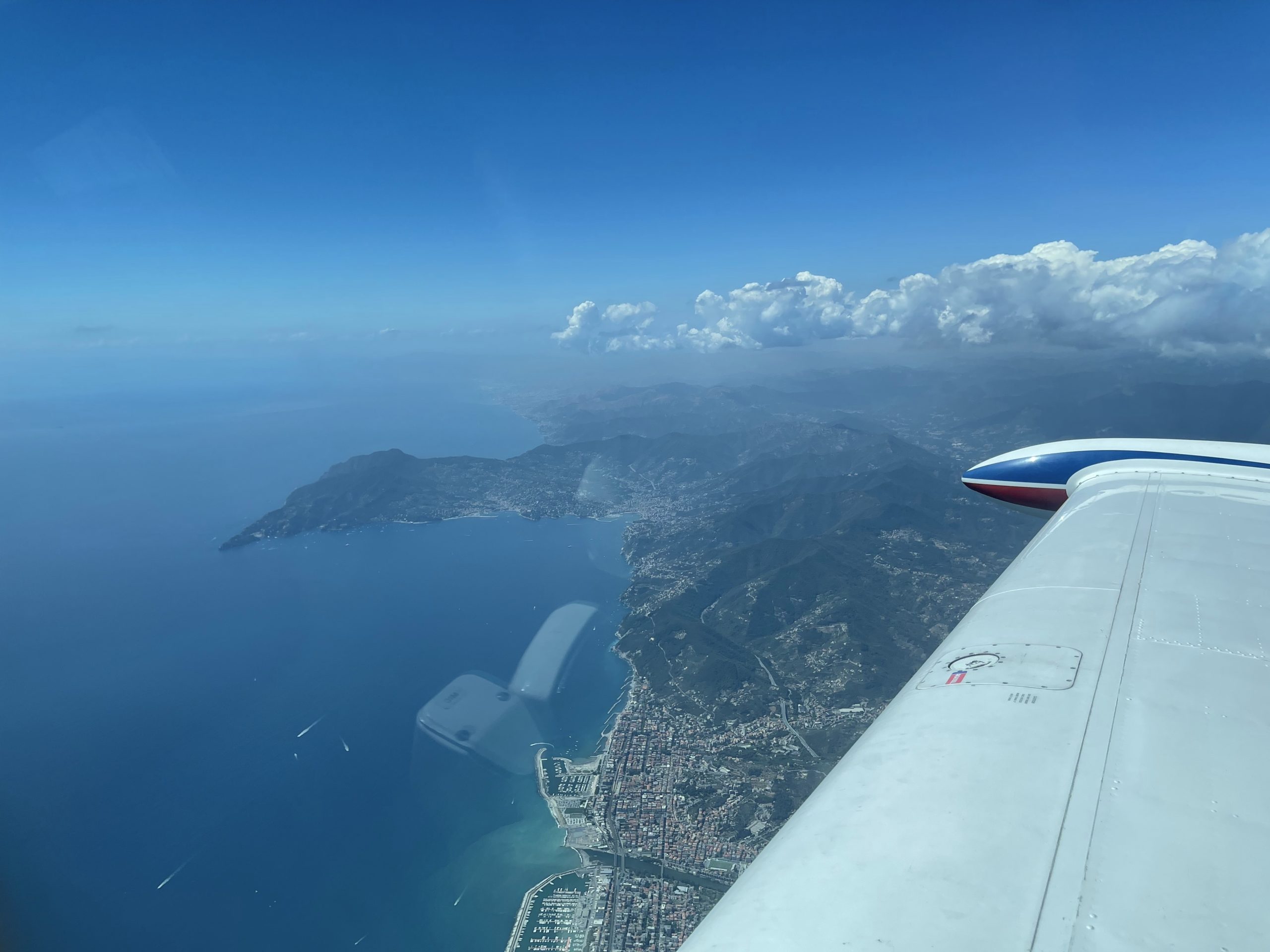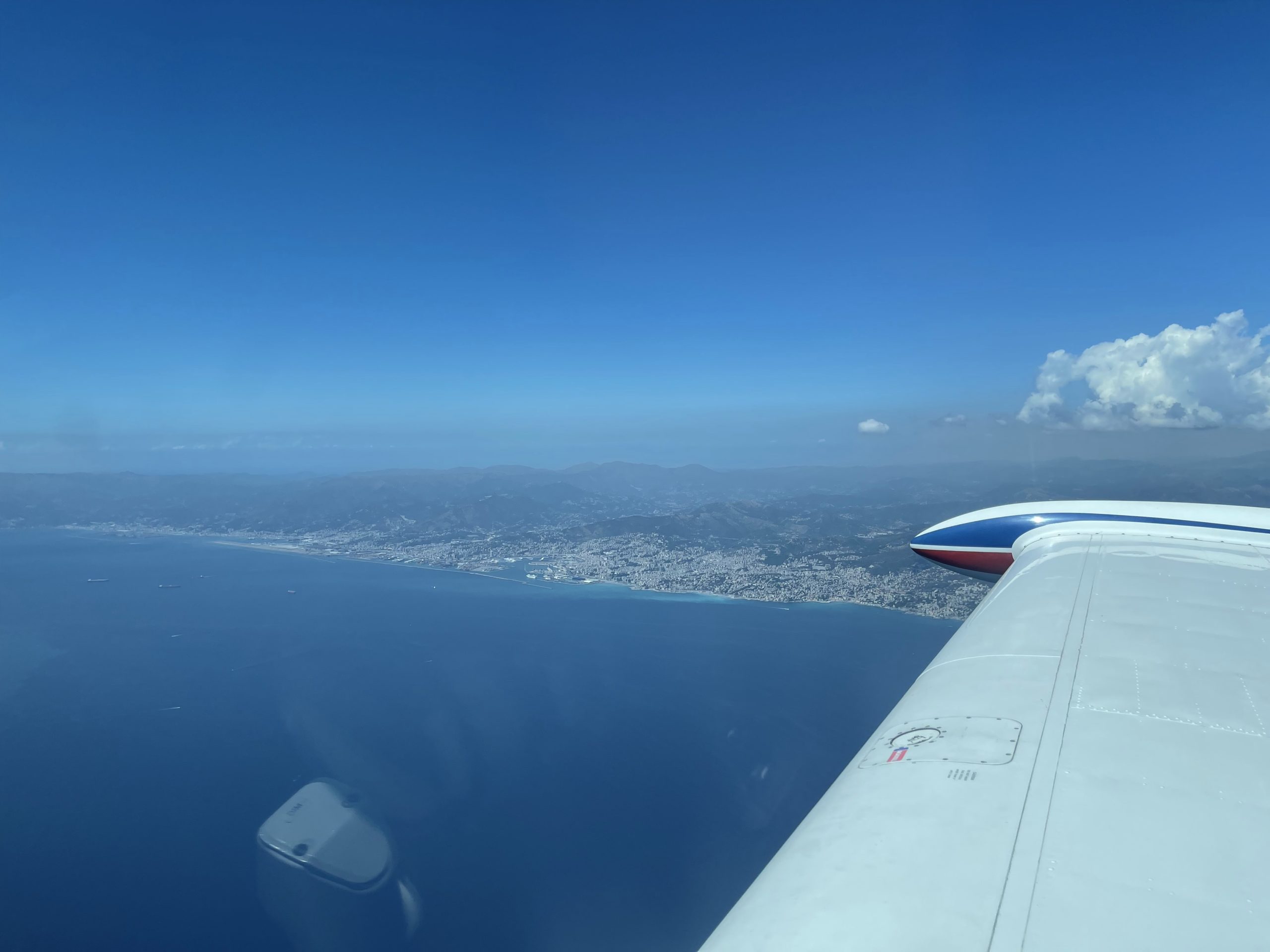 La météo est exceptionnelle , quelques nuages sont sur notre route et demandons à monter au 95 .. aujourd’hui , on ne doit pas les toucher … un petit couloir entre 2 nuages , nous passerons la , au dessus des reliefs culminant à 5400ft ! Et on demande à genes l’autorisation de descendre sur un cap 260° a 5000ft sur la mer ! Nous longeons gênes , c’est ouf de beauté !