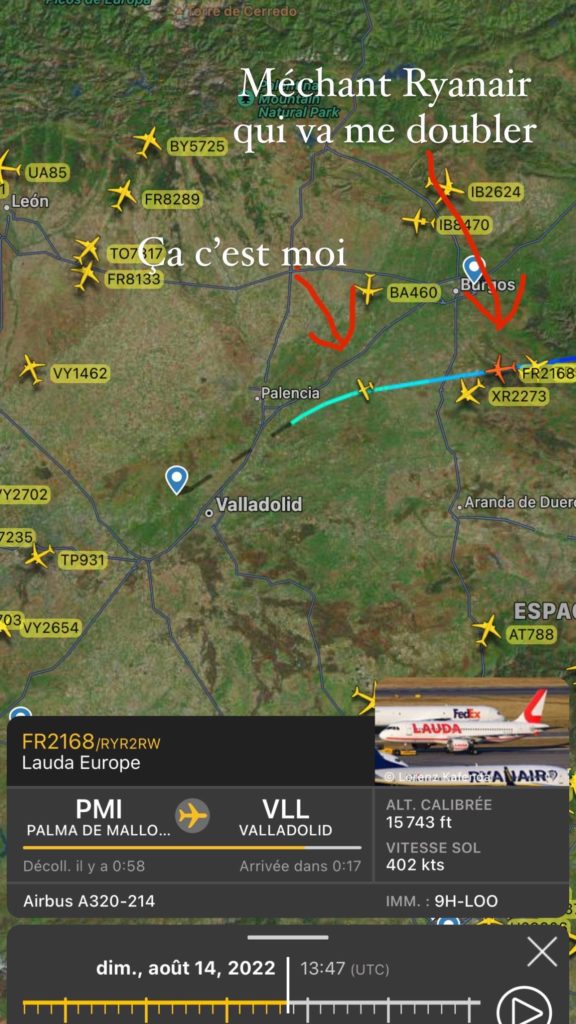 je repasse sur la fréquence précédente, le controlleur me donne une autre fréquence .., je réessaye … idem … je repasse sur Madrid, qui me dit ” Vous n’êtes plus dans ma FIR, Byebye”